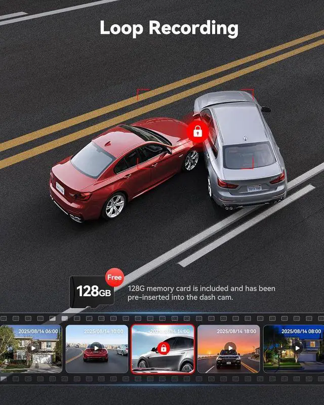 [Loop Recording & Free Memory Card] This car camera supports seamless loop recording to ensure continuous coverage without interruption. Older files are automatically overwritten when storage is full, while important events are safely locked. A free memory card is included, giving you ample space for 4K recordings and allowing you to use the camera right out of the box.