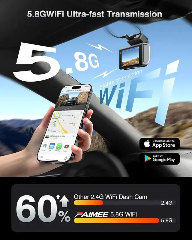 STABLE CONNECTION WITHOUT DROPOUTS: Dash cam front and rear built-in GPS and upgraded dual-band 5.8 ghz/ 2.4 ghz WiFi integration allows real-time video streaming and instant downloads via the app. Built-in GPS logs speed, route, and location data, ideal for fleet management or travel! With always-on 5GHz Wi-Fi, reducing lag during liveview, you can more easily access videos and photos recorded on your phone through " FAIMEE" App, and share travel moments to your family and friends on social media.