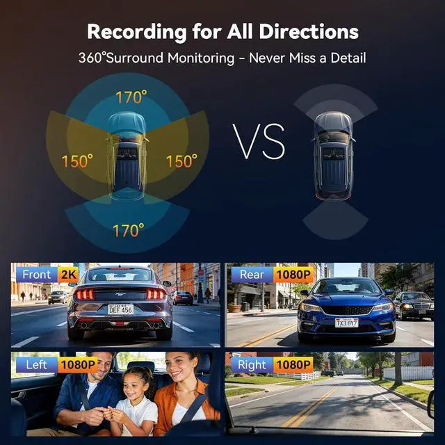 See Everything, Miss NothingNo more blind spots. With 2K 4 channel dash cam recording at the same time, you get full front, rear, and side coverage to capture every moment around your vehicle. From busy intersections to tight parking spaces, every detail is recorded clearly, giving you confidence and reliable evidence when it matters most.
