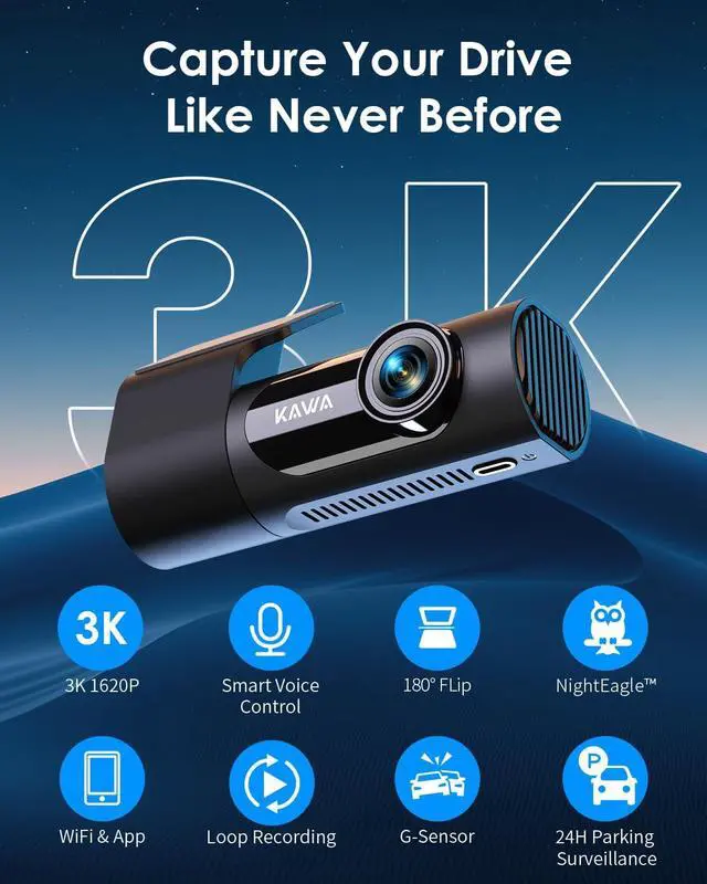 Starlight Color Night VisionWith a 6 Full HD spherical glass lens, our 2K dash camera features industry-leading Starlight Color Night Vision for clear images and videos even in low-light environments at night, without auxiliary light sources. KAWA mini dash cam with compact and hidden design make sure it will never block your view. You can drive smoothly day and night.