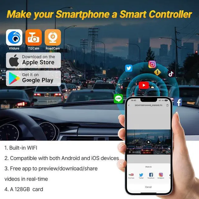 Built-in WiFi & Free APPEnjoy seamless integration with both Android and iOS devices through the dedicated free app. Preview, download, and share your recordings in real-time, making video management effortless - Due to mobile phone compatibility issues, we have prepared 3 APPs for use with our 2023 rav4 dashcams - ' ' Virrdure' ', " Ti2cam", " Roadcam". * NO NEED to keep WiFi connected after the first use, the camera will auto-record after car engine starts. You can use CarPlay/Bluetooth normally