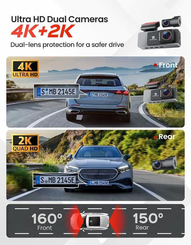 Rear Recording: This dash cam supports dual-channel simultaneous recording, capturing both front and rear footage. The front dash cam records in stunning 3840×2160P resolution, while the rear camera delivers crisp 2560×1440P clarityensuring detailed coverage of the road ahead and behind. With a 160° ultra-wide-angle front lens and a 150° rear lens, it minimizes blind spots and captures crucial details across multiple lanes.