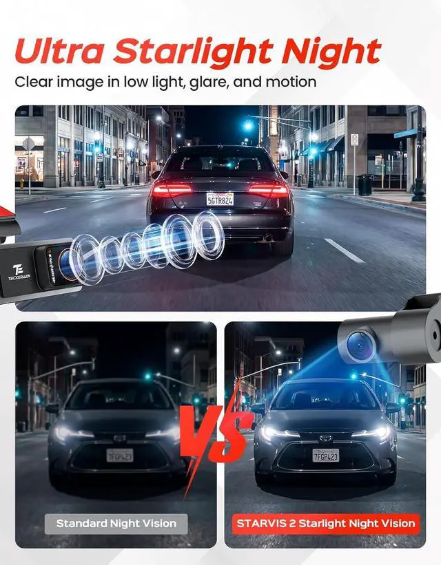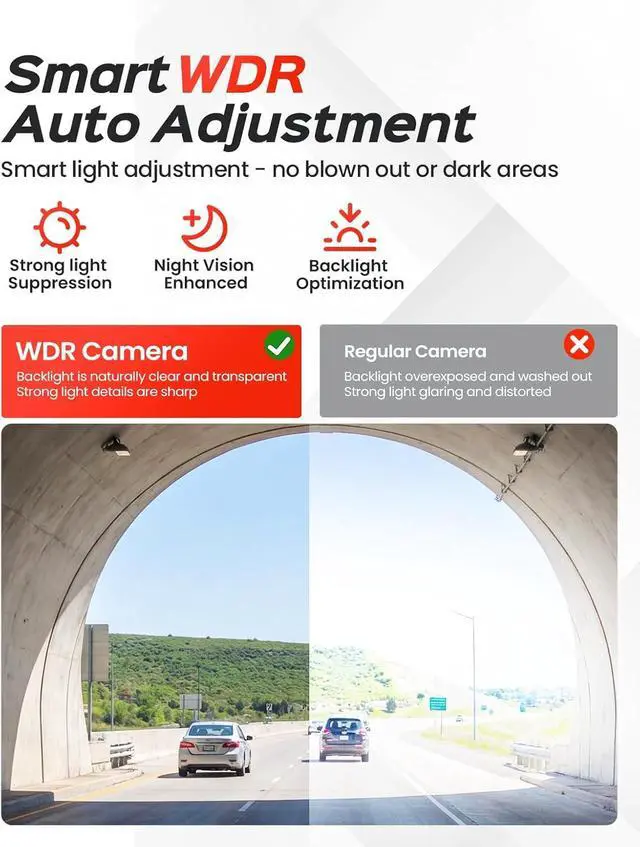 Super Starlight Night Vision: Equipped with a STARVIS image sensor and an F 1.8 large aperture, the dash camera significantly enhances light intake for vivid, detailed footage even in low-light conditions. Advanced WDR (Wide Dynamic Range) technology balances bright and dark areas, suppressing glare from headlights while preserving key details like license plates and road signswhether youre driving through dimly lit streets, country roads, or parking lots.