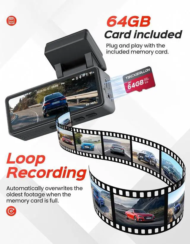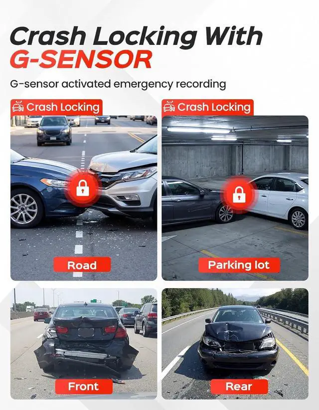 Seamless Loop Recording & G-Sensor Protection: Pre-installed with a 64GB SD card, the dashcam is ready to record right out of the box. Loop recording ensures continuous coverage by overwriting the oldest footage, while the built-in G-Sensor automatically detects sudden braking, collisions, or impactsinstantly locking and protecting video clips from being overwritten. This safeguards critical evidence when you need it most.