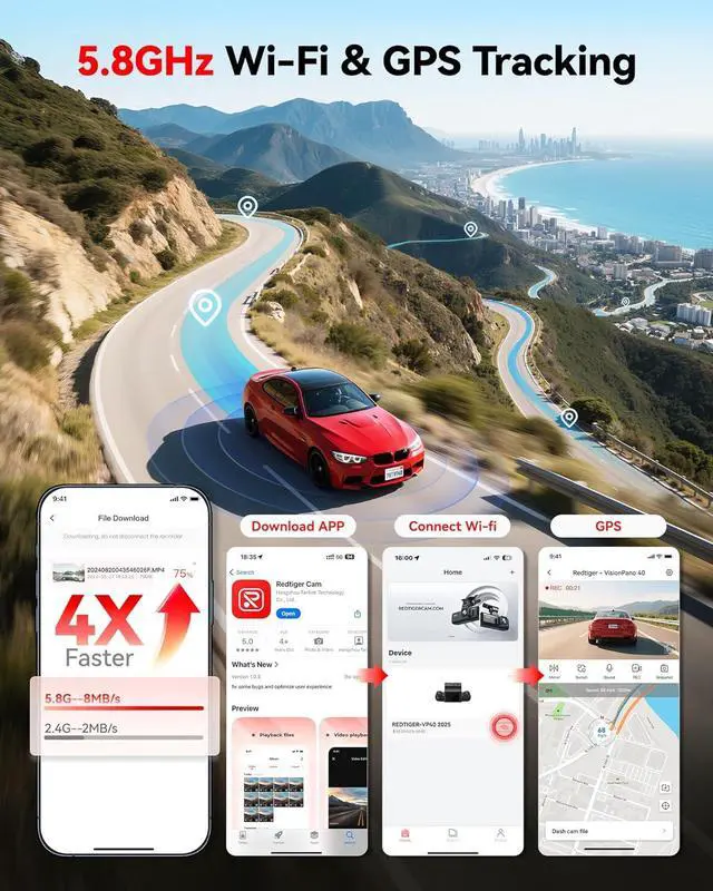 [4x Faster 5.8GH z Wi-Fi & Built-in GPS] Ultra-fast 5.8GH z Wi-Fi offers video transfer speeds four times faster than common 2.4GH z Wi-Fi, allowing for quick access via the Redtiger Cam app. Preview, edit, and share footage from all four channels with ease. The built-in GPS tracker accurately logs your speed, route, and location. All data is seamlessly synced and accessible through the app, giving you full control from anywhere