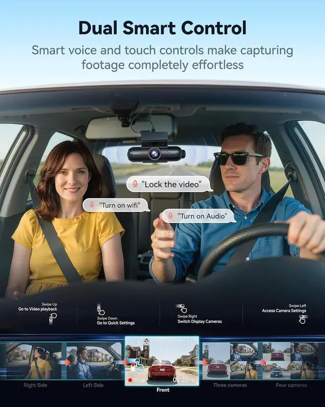 [Voice Control & Touchscreen Operation] Operate your 4-way 360 car camera hands-free with simple voice commands, so you can keep your eyes on the road. The intuitive touchscreen lets you navigate menus, review footage, and change settings with just a tap. By seamlessly blending safety with convenience, this comprehensive 4-channel system is the ideal driving companion for the modern driver
