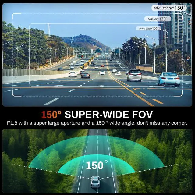FRONT RECORDING: Kolvt 2K dash cam offers recording from the front. The front camera records at 2560x1440P @30fps, ensuring clear recordings of the road ahead. With a 160°ultra-wide angle for the front camera, you' ll capture more of the road with this 2K dash cam