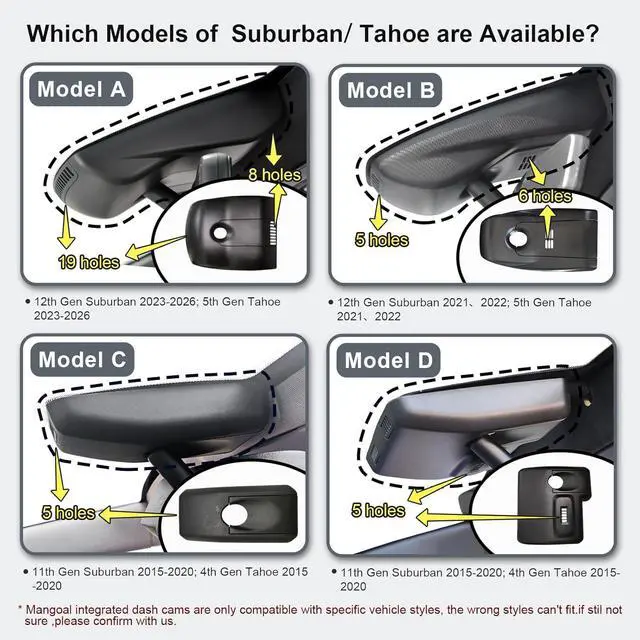 Custom fit for Chevrolet Suburban/TahoeMangoal 4k dash cam can fit perfectly behind the rear view mirror like original. No messy wiring exposed, no complicated rewire at all. Perfectly intergrated with Chevrolet Suburban/Tahoe 2015 2016 2017 2018 2019 2020 (Model C). Such as 1500 LS LT Premier LTZ.