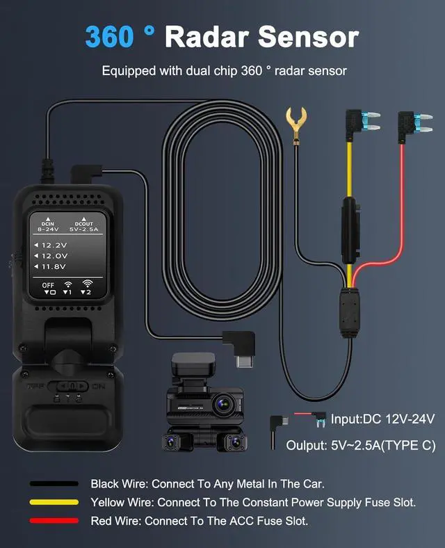 Task accomplishedThe universal compatibility input of the hardwired kit ranges from 12V to 24V, while the output is 5V/2A. The kit is equipped with a Type-C port that is compatible with all dashboard cameras.