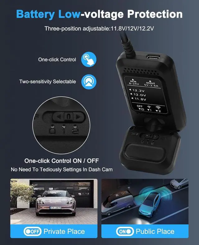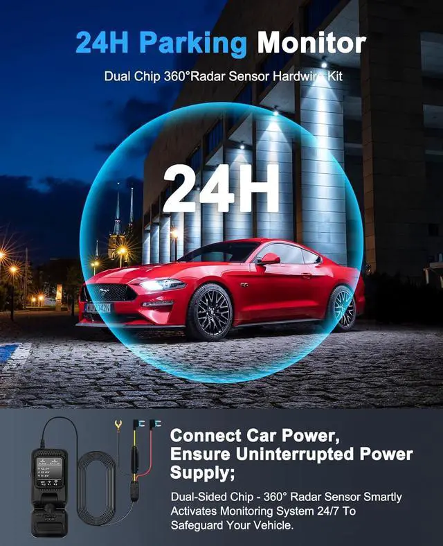 24 HOURS MONITORThe vehicle hard-wire kit connect to car battery or fuse box power, can realize continuous power supply for 24 hours. It can keep powered on even car turned off. Even when the car is turned off, it can still maintain power. When there are people around the car, it automatically starts the recorder to capture footage.