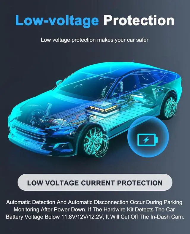 Low Voltage Protection Multiple Safety Features Featuring a low voltage protection function, the hardwire kit will automatically cut off power 60 seconds after voltage drops below 11.8V (± 0.2 ). Not suitable for trucks with voltage above 24V. Additional safety features include overcurrent protection, short circuit protection, reverse connection protection, and overheat protection.