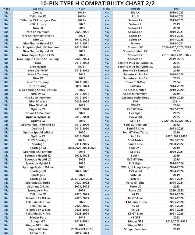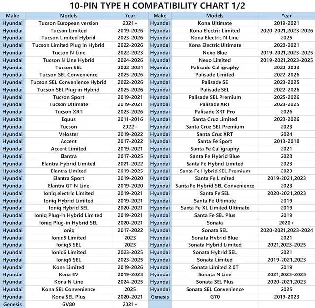 Applicable ModelsIf your car model is not listed in the picture, you can check the number of pins and the appearance of your car' s connector, this dashcam power adapter is suitable for select Hyundai Tucson, Elantra, IONIQ, Accent, Kona, Santa Fe, Sonata, Sonata, Santa Cruz, Palisade, Veloster, Genesis, Kia, EV6, Forte, Carnival, Sportage, K5, Telluride, Rio, Sorrento, Soul, Sedona, Optima SX-T, Xceed, Stinger, Optima, Niro and more, and it may be compatible with other makes and models of cars, you can tell us the car model to help you find the correct power adapter.