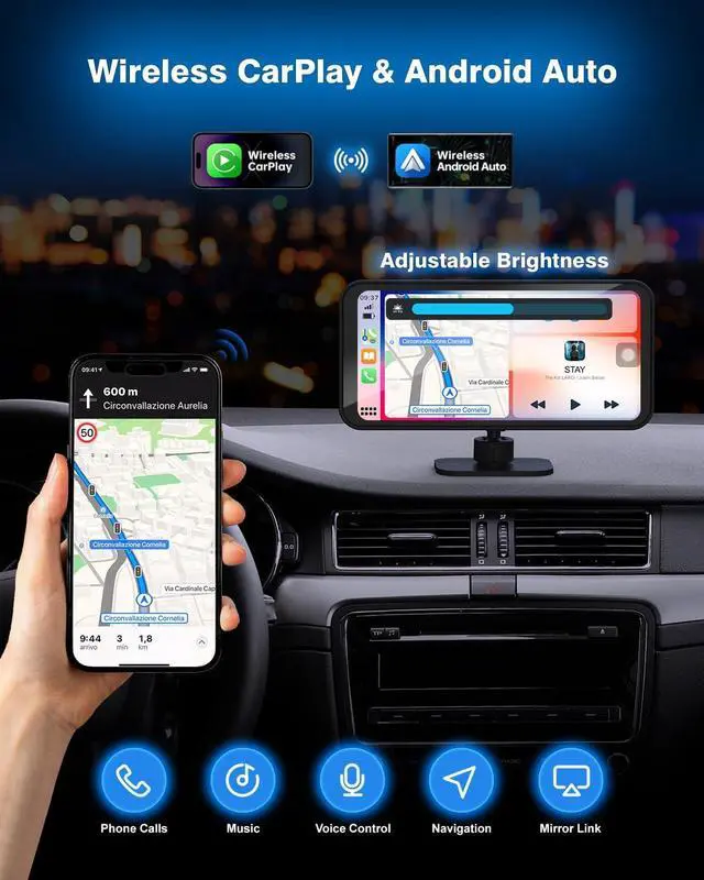 Wireless CarPlay/ Android Auto Screen - Portable Car Play screen for cars without it, compatible with Apple Carplay and Android Auto. Easy access apps, FM radio, music, navigation, calls and messages directly from SPRLEAF Smart touchscreen. Auto connect after first setup, making daily commute more enjoyable and stress-free.