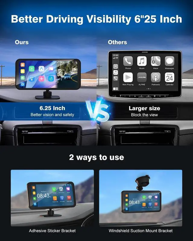 Easy Installation Fit All Different Cars- Effortlessly add CarPlay/Android Auto to any car with Sprleaf Apple carplay and android auto screen. Choose between on-dash bracket or Windshield Suction mounting. The hassle-free installation process preserves your car' s console. Compatible with a variety of vehicles, including cars, trucks, vans, buses, and pickups, ensuring versatile and user-friendly installation