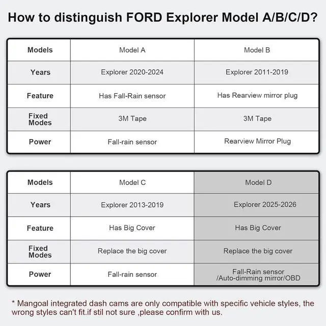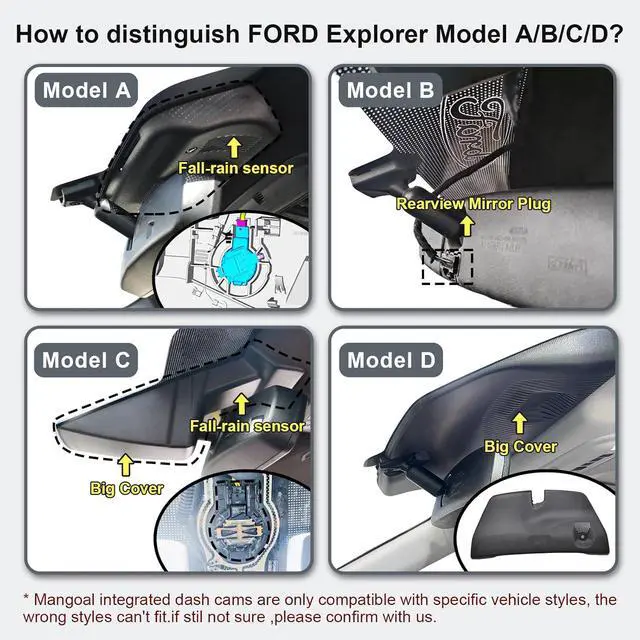 Custom fit for Ford ExplorerMangoal Front 4K & Rear 1080p dash cam can fit perfectly behind the rear view mirror like original. No messy wiring exposed, no complicated rewire at all. Perfectly intergrated with Ford Explorer U625 2020-2024 vehicle styles. Such as Base, XLT, ST_Line, ST, limited, Timberline, Platinum and King Ranch. COMPATIBLE WITH ALL VEHICLE STYLES EQUIPPED WITH RAIN FALL SENSOR!