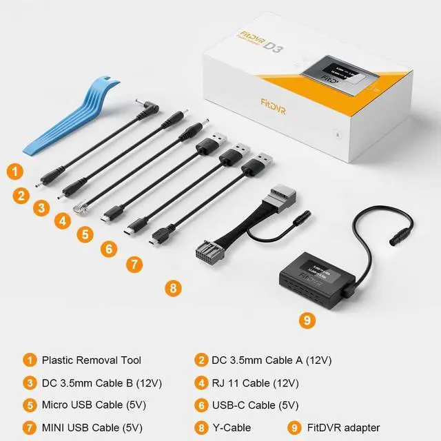 6 Output Cables IncludedIncludes Mini USB (5V) x1, Micro USB (5V) x1, USB-C (5V) x1, RJ11 (12V) x1 and DC 3.5 mm (12V) cable x2.