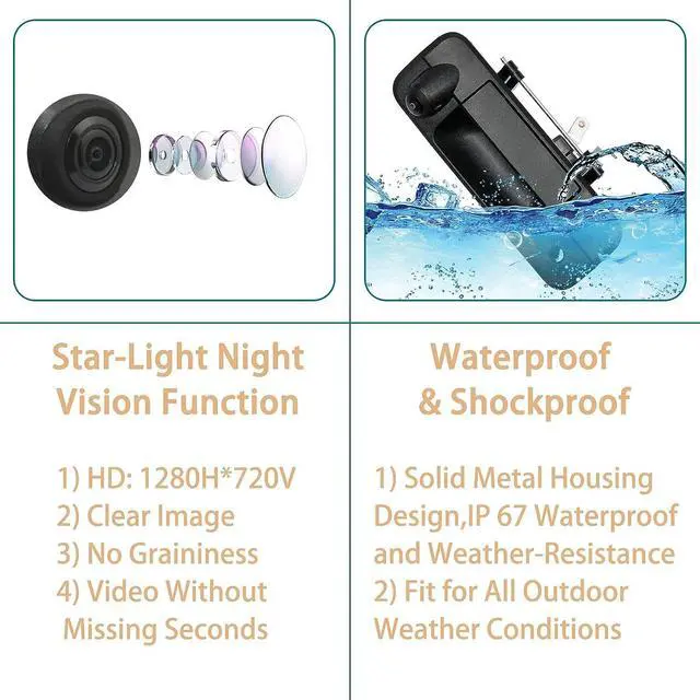 IP67 WaterproofThe back up camera is made by high-purity resign, with international standard IP67K waterproof. And our tailgate handle is crafted from reinforce ABS plastic and surface-treated to create durable surface for years of handling. So you can use it daringly whatever its rainy/snowy/hot.