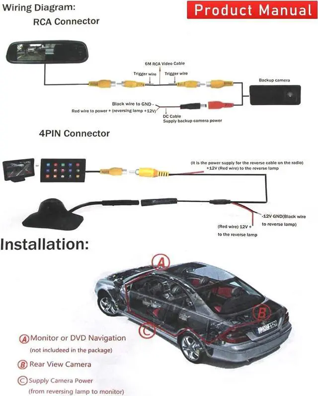 Easy InstallationThis reverse parking camera will fit exactly like the OEM, and easy installation. Just need to connect cameras power to reversing light, then connect the rear view camera to your radio screen or monitor by 8M universal monitors (RCA) cable which we provide for you. Hi-definition color pictures, sensitive real time and continuous.