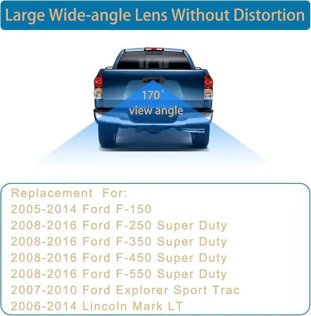 Fit OE Number8L3Z9943400AC. Compatible with 2004 2005 2006 2007 2008 2009 2010 2011 2012 2013 2014 Ford F150. 2008 2009 2010 2011 2012 2013 2014 2015 2016 F250/F350/F450/F550 Super Duty. 2007-2010 Explorer Sport Trac. 2006-2008 Lincoln Mark LT. This Backup Camera will meet or exceed OEM standards. FOR OEM MONITOR.