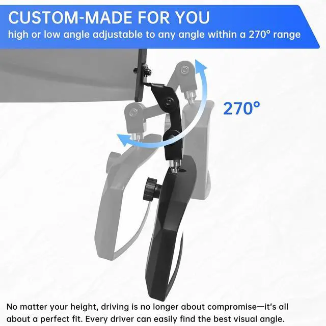 Custom-made for youThis Polaris Ranger rear view mirror no matter your height, driving is no longer about compromiseits all about a perfect fit. Every driver can easily find the best visual angle, thanks to an innovative support system with two extra joints that allow 270° adjustment in every directionup, down, forward, and backward. The mirror itself can also be adjusted 360° in any direction, offering a combination of freedom, comfort, and safety.