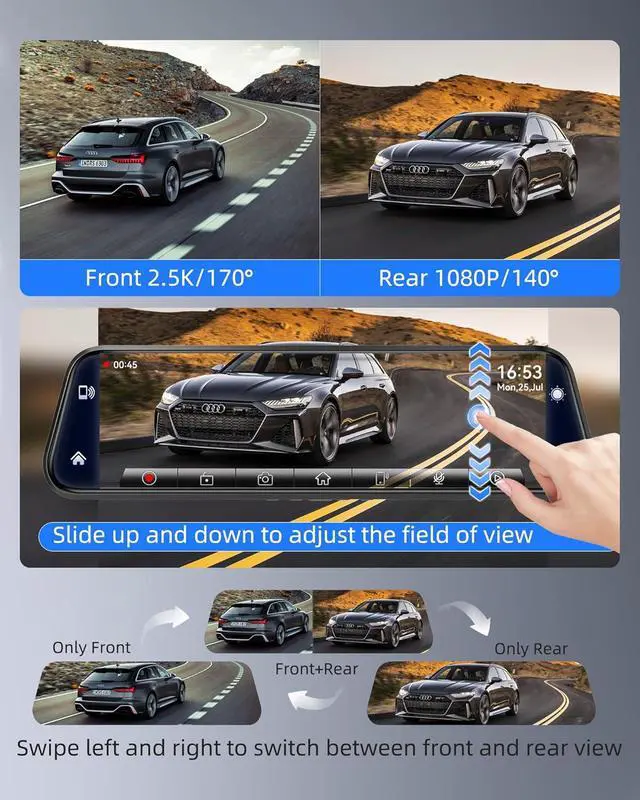 Driving ProtectionThis rear view mirror camera equipped with front QHD 2.5K & rear FHD 1080P, sharply capture your driving details, such as car plate, road sign. WDR was featured for you to see clearly in overexposed or dark environments. With front 170°and rear 140°, providing trusted evidence for any situation.