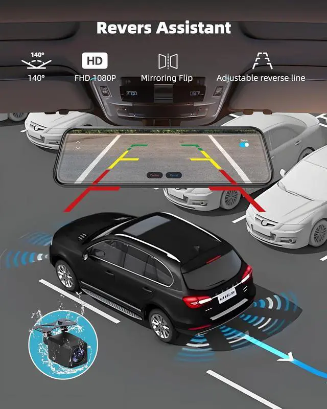 Multiple Function as Car-guard: This rearview mirror camera has three driving auxiliary functions. Loop recording with free 64GB Card and the duration can be set to 1/3/5min, auto cover old unlocked filmsmannual lock. Reverse assistant auto starts when switch to R, provide safer backup vision. Support parking monitor mode if needed (Parking monitor cable not included)