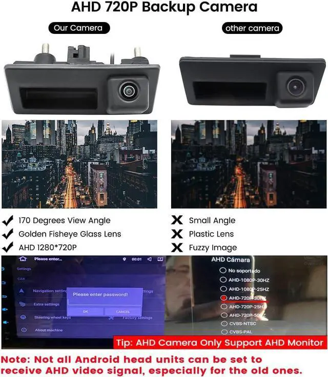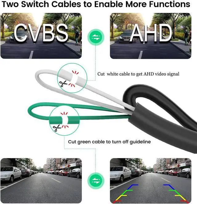 Support Both AHD and CVBS Video Signal---This vehicle rear view camera can work with both AHD monitors (AHD 720P 30HZ ONLY) and CVBS monitors. Its output video signal is CVBS by default, if you need it to connect with a AHD monitor, please cut the white cable on the camera and reconnect to power supply. AHD video signal image is much clearer than CVBS.