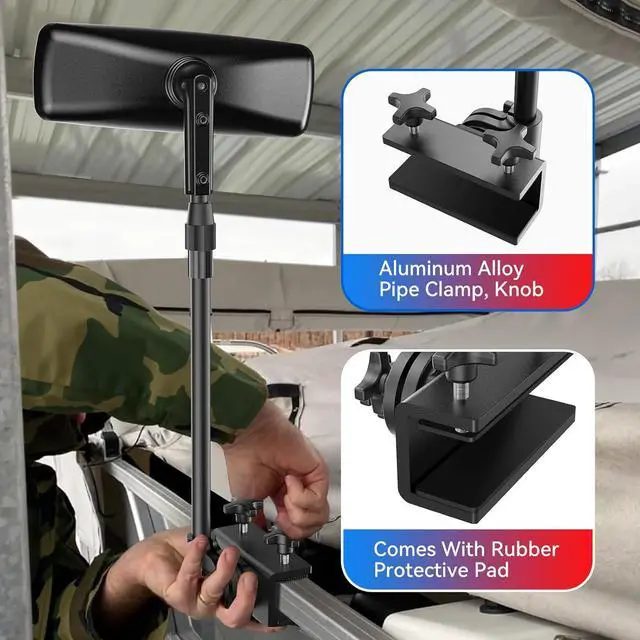 [ Stable Pontoon Boat Mirror ] Ours uses heavy-duty structural aluminum alloy pipe clamps with a length of 5 inches for firm fixation. The special process is more durable than ordinary plastic clamps and prevents long-term corrosion from seawater. We also use rubber pads in the pontoon mirror frame tube to protect the hull from damage. The boat rear view mirror will not shake when you sail, you only need to tighten the knob above the pipe clamp