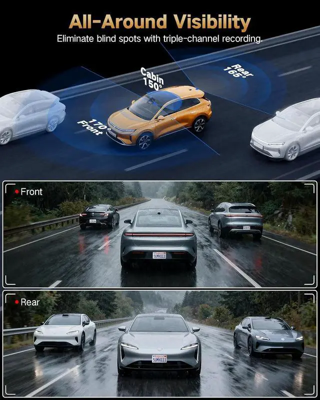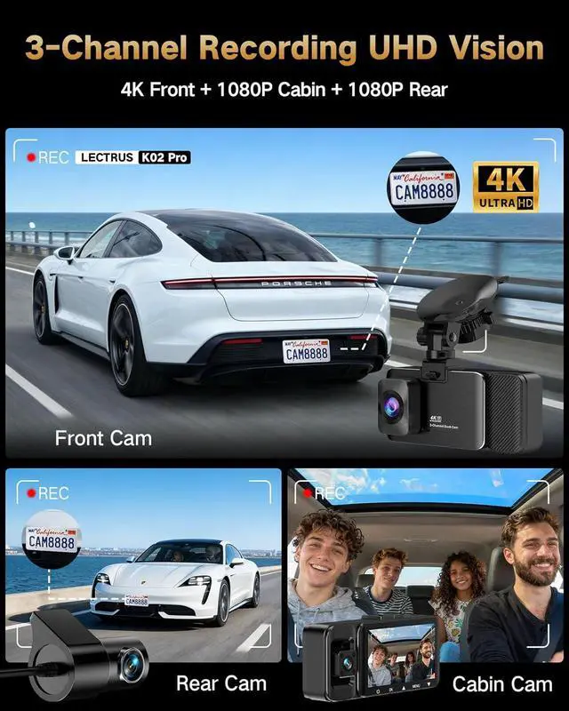 Ultra-HD 4K front + 1080P rear + 1080P interior recording The Lectrus dash cam supports 3-channel simultaneous recording, capturing the front, rear, and interior at the same time. The 170° wide-angle front camera covers up to six lanes and clearly records license plates, traffic signs, and important details ideal as a reliable video evidence on the road.