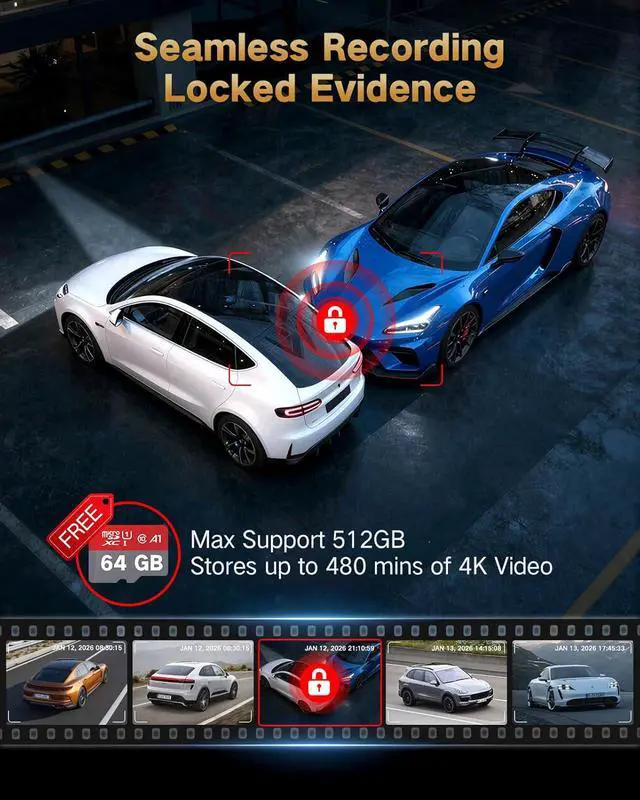 Loop Recording & G-Sensor for Secure Evidence - The front and rear dash cam comes with a free 64GB SD card and is ready to use immediately. Loop recording ensures continuous footage, while the G-sensor automatically locks important videos in case of a collision so they are not overwritten. Supports memory cards up to 256GB.