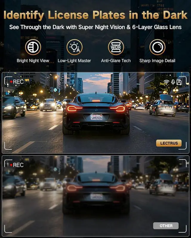 Strong Night Vision with WDR Technology - Thanks to enhanced WDR technology and advanced night vision, the dash cam produces clear and detailed footage even in low-light conditions. The front camera with F 1.5 aperture and the rear camera with F 1.8 aperture let more light in, capturing bright and sharp videos at night or in dark environments perfect for accident evidence.