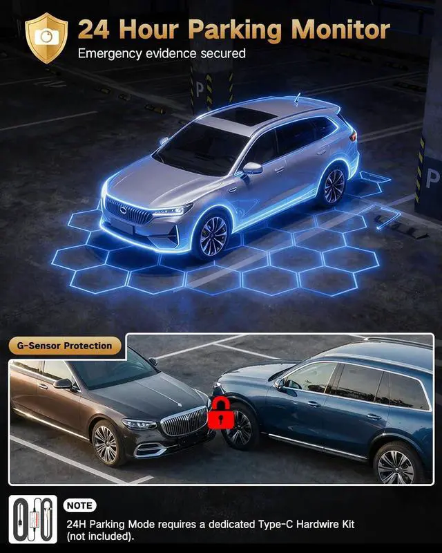 24-Hour Parking Surveillance for Added Safety - With time-lapse recording and the G-sensor, the dash cam protects your vehicle even when parked. In time-lapse mode, it records continuously at low frame rate and low power. Any collision or impact automatically triggers recording and locks the video.