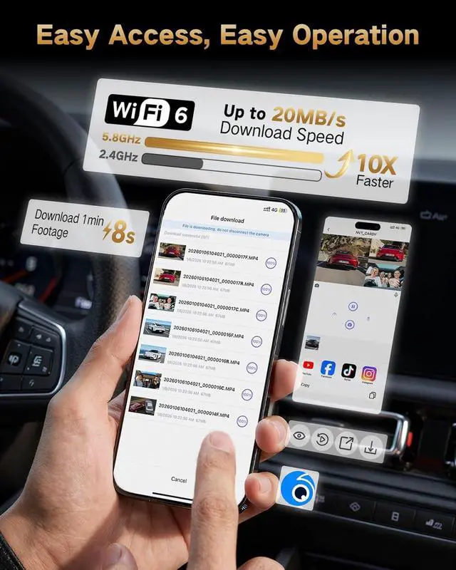 Ultra-Fast 5.8GH z WiFi with Free App - The dash cam supports dual-band WiFi ( 5.8GH z / 2.4GH z) and connects quickly to your iOS or Android smartphone. Through the free app, you can view, download, and manage videos, as well as easily share recordings with friends, family, or your insurance company.