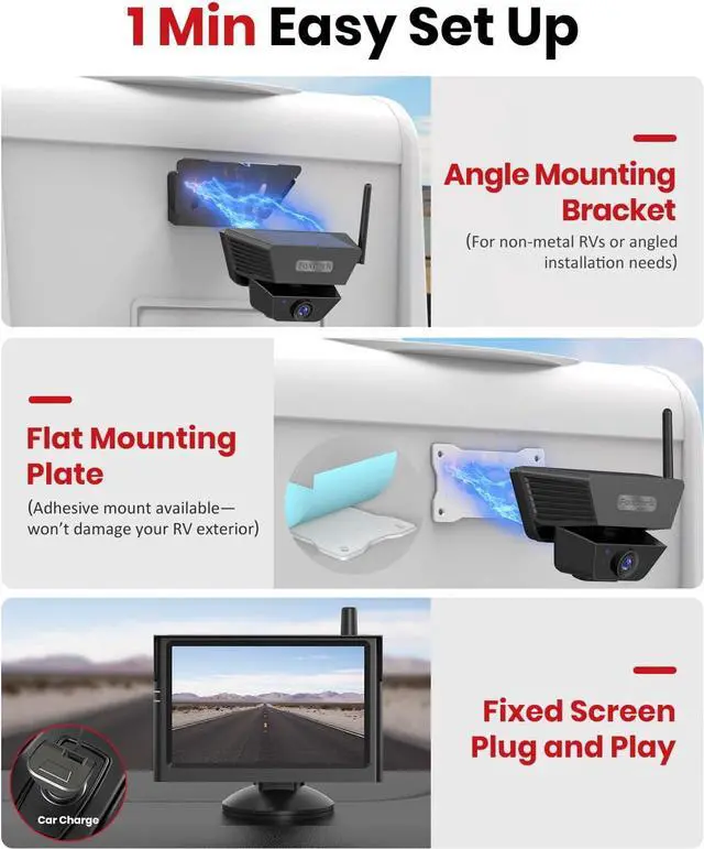 Any Road: Snap the solar wireless backup camera onto metal surfaces in seconds; the built-in magnet holds tight even on bumpy rides. For non-metal vehicles, use the included adhesive metal plate for a secure setup that wont damage your cars surface, giving you a firm, flexible mount wherever you drive