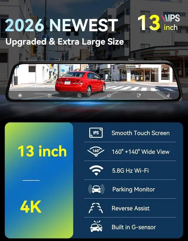 Upgraded 13' ' Large-format TouchscreenA dual leap in visual& operational! The larger viewing area clearly presents key details in the footage, allow you quickly capture core information without deliberate focus while driving. Spacious split-screen display for front and rear road conditions-ideal for vehicles with larger cockpits. Enlarged touch icons boost operational accuracy, effectively reduce risks of inadvertent operation during driving, and ensure safer driving experiences