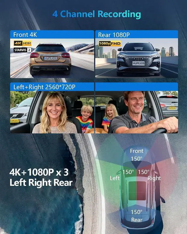 Eliminate Blind Spots with True 360° 4-Channel RecordingSee every angle around your vehicle. The front camera records in ultra-sharp 4K UHD with a 150° wide view, while the left, right, and rear cameras capture simultaneous 1080P HD footage. This complete coverage is crucial for documenting complex city intersections, parking lot incidents, or rideshare passenger interactions with undeniable evidence