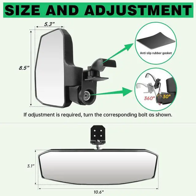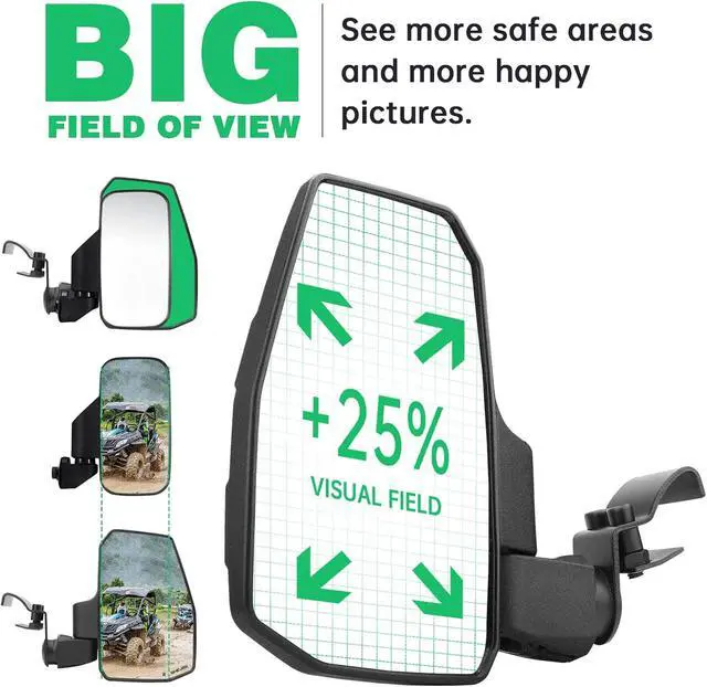 2024 Newly designed and manufactured UTV side mirrors with spring-return feature easily reset to the previously set position after folding, eliminating the need to manually pivot, while improving passenger-side viewing angle for improved driving experience and safety