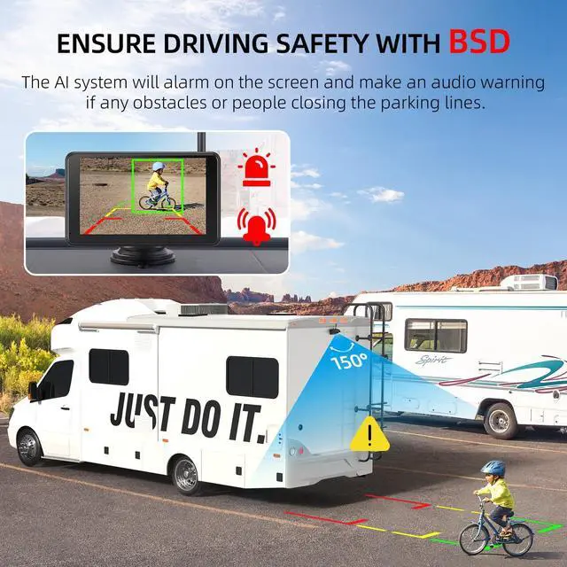 BSD Design for Safety Driving: To escort your driving safety, our backup camera supports BSD (blind spot detection). After you customize the settings, the AI system will alarm on the screen and make an audio warning if any obstacles or people closing the parking lines