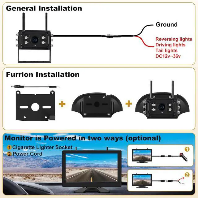 [Wireless System & Easy Installation]The wireless backup camera with digital wireless transmission makes the installation much easier. Just connect the camera and monitor separately to the power supply. (1) Power the monitor by the included cigarette lighter or ACC switch. (2) Connect the camera to a continuous power source like a Tail light/Running light/license plate light for monitoring, or connect to a backup light for reversing only.