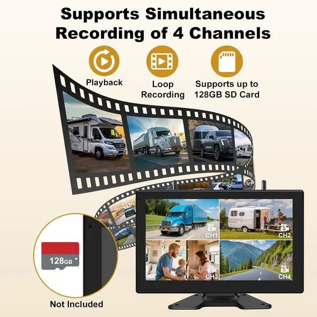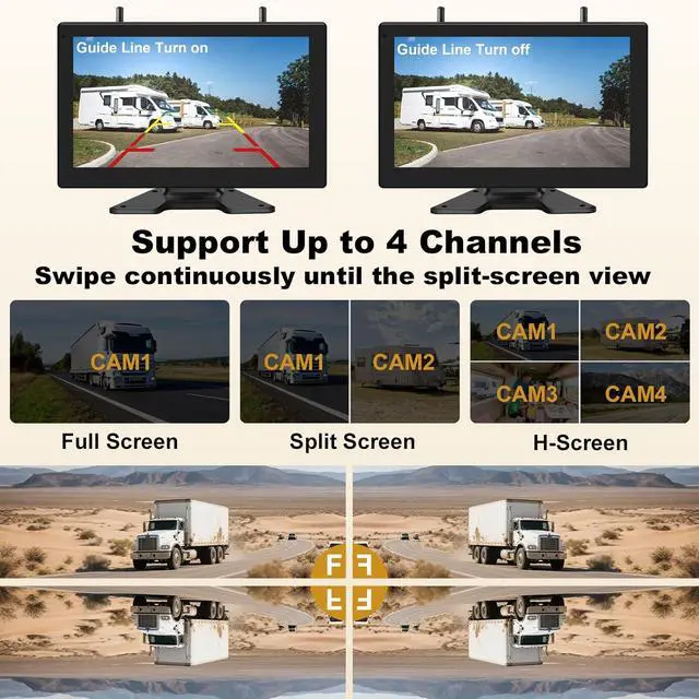 [Expandable with 4 Channels]Backup camera wireless supports up to 4 cameras to be used simultaneously. It can simultaneously monitor different scenes of vehicles on the front, side, and behind when the rv is changing lanes on the road and switch between them with ease. 150° golden wide viewing angle, saying goodbye to blind spots and parking difficulties.