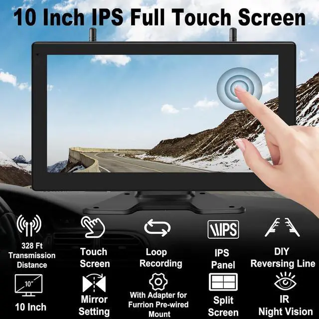 [10 Inch IPS Large Touch Screen]Wireless backup camera for truck comprises a 10 inch touch screen monitor and 2 1080P cameras. The IPS panel large touch screen monitor can bring you the best driving/reverse experience. Two cameras to cover all angles, providing you with a more comprehensive view of your surroundings.