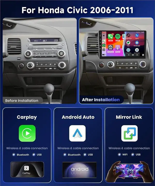 3Wireless CarPlay & Android AutoThis radio for honda civic supports wireless CarPlay and Android Auto, letting you access your phones apps more easily. You can also wake voice assistant to operate the head unituse GPS navigation, calls, messages, music, and more, all hands-free for safer driving