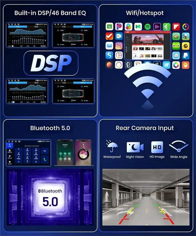 5 AHD Backup Camera & Built in-DSP & 36EQCar audio system includes a 170° viewing angle AHD IP69 waterproof backup camera. When reversing, the radio screen switches automatically, making parking safer and easier. Its DSP audio technology lets you fine-tune frequencies, AE, and a 36-band EQdelivering rich bass even without a subwoofer