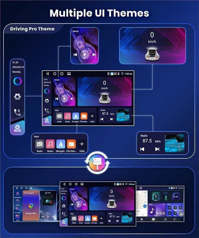 6Multiple UI Themes & Customize Home PageThis car head unit lets you customize each apps position, with easy app switching via a simple swipe. It also offers Multiple UI themes for personalization and supports split-screen to use two apps at once