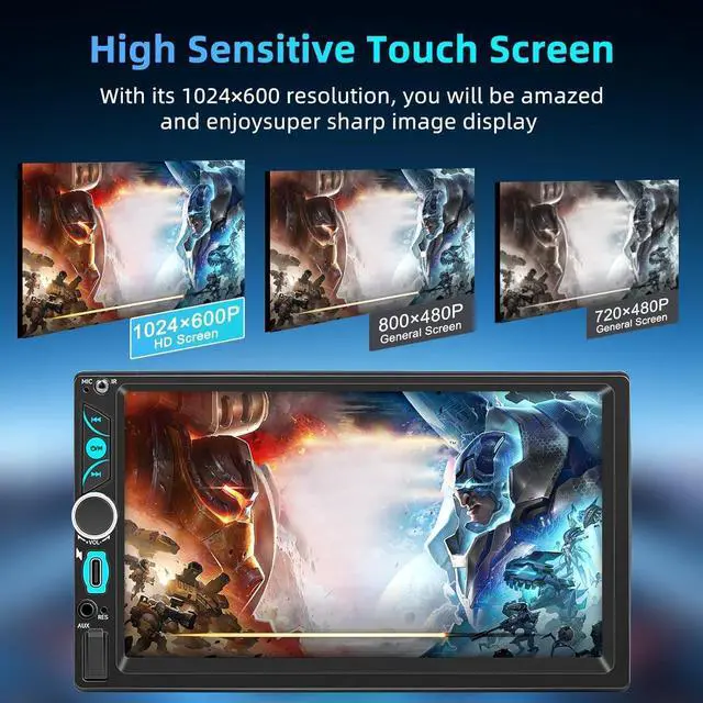 Mirror Link & HD TouchscreenThe double din radio is compatible with most Android and iOS smartphones. Simply connect your phone via wired or wireless connection to synchronize your phone' s content with the car audio system, enabling seamless navigation, video playback, and more. Double din car stereo features a 7-inch HD touchscreen with 1024×600 resolution, supporting 1080P video playback for crisp, smooth visuals.