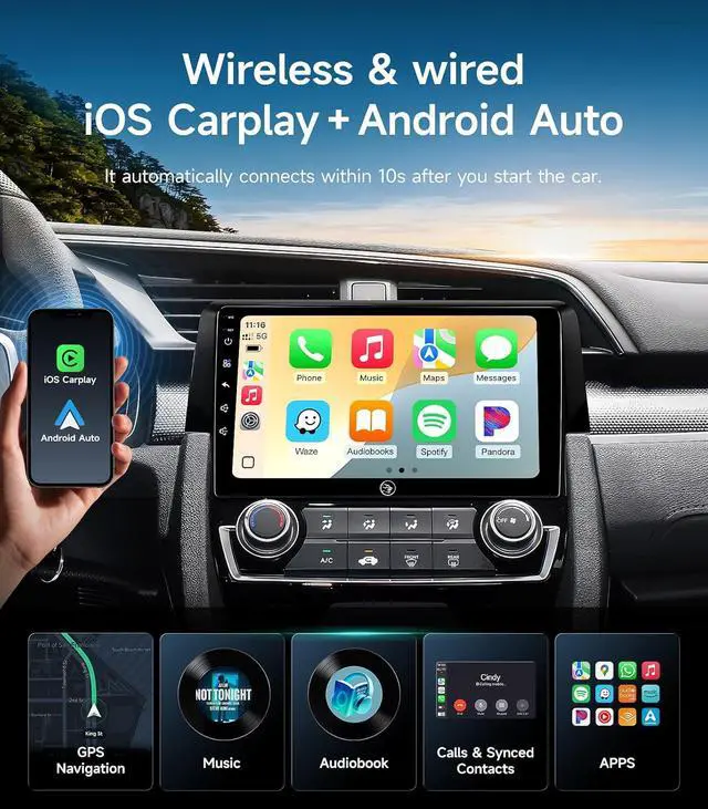 Wireless Carplay & Android AutoStay safe on the road with this Android car radio! Connect your iPhone via Bluetooth or Android phone via USB to access navigation, messages, music, and more from your phone' s familiar apps. Certified by the FCC and CE for safety, this upgrade keeps you connected while keeping your eyes on the road.