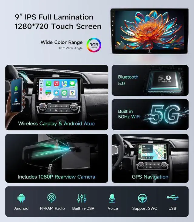 Powerful FunctionsUpgrade your Honda Civic with our 9-inch IPS touchscreen Android 13 system, featuring 2GB RAM and 32GB ROM for a smooth and responsive user experience. This 100% standard-size unit requires no additional accessories, ensuring a seamless plug-and-play installation that transforms your car' s interior.
