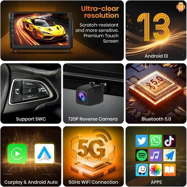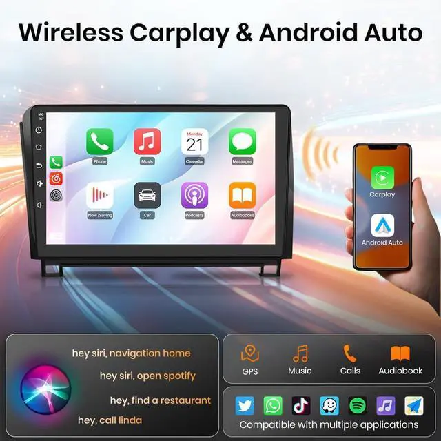 • Wireless CarPlay & Android AutoA Smart Way to Use Your Phone in the Car, Simply connect your iPhone/Android device to the Android car stereo via Bluetooth. Use a smart voice assistant or touch the display, you can get directions, make calls, send and receive messages, enjoy music, etc.