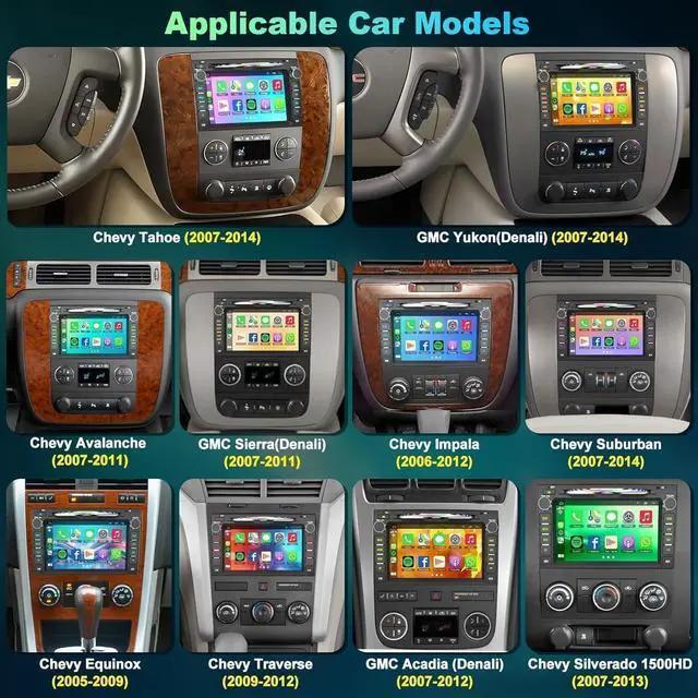 Applicable Car ModelsCar stereo for Chevy Silverado 1500HD 2500HD 3500HD (2007-2014) (Second Generation); For Chevy Avalanche (2007-2011); For Chevy Express Van (2008-2011); For Chevy Impala(2006-2012); For Chevy Tahoe (2007-2014); For Chevy Equinox (2005-2009) (First Generation); For Chevy Suburban (2007-2014); For GMC Acadia (2007-2012); For GMC Savana (2008-2013); For GMC Sierra (2007-2011); For GMC Yukon (2007-2013); For Buick Enclave (2008-2012)