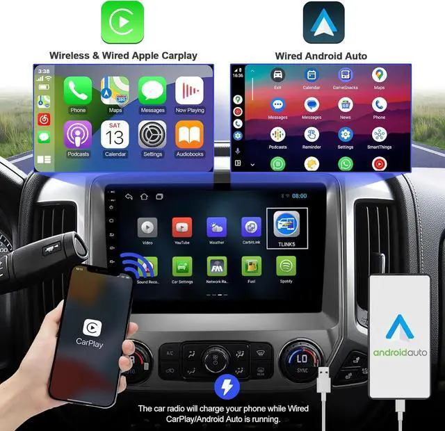 Carplay & Android Auto: Wireless/Wired Carplay & Android Auto. AUMUME Car stereo has a built-in WIFI6 function, supporting 5Ghz and 2.5GH z dual-band WiFi. The wireless connection to CarPlay has lower latency and is more stable. Use the original USB data cable to connect the Apple or Android phone, and sync the phone APP with the car radio. Run online navigation, make hands-free calls, send/receive SMS, and listen to music/podcasts in CarPlay or Android Auto while you focus on driving.
